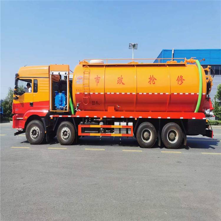 The 33 square large Dongfeng Tianlong front four rear eight cleaning and suction dual-purpose vehicle has multiple functions such as dredging, suction, and cleaning. With one roof and three vehicles, the high-pressure water pump driven by the chassis engine generates 19MPa high-pressure water, which is sprayed forward and backward at high speed through a special nozzle. The forward jet can break through the blockage in front, while the backward jet not only flushes the pipeline wall and removes sediment, but also drives the nozzle and spray hose to automatically enter the depth of the pipeline. The hydraulic driven water pipe reel can control the direction and speed of nozzle movement. When the nozzle moves forward, it can break through the blockage in front, flush the pipeline wall, and when it moves backward, it can better wash away the sediment and bring it to the sunken well at the entrance of the pit. Repeated flushing back and forth produces better results.