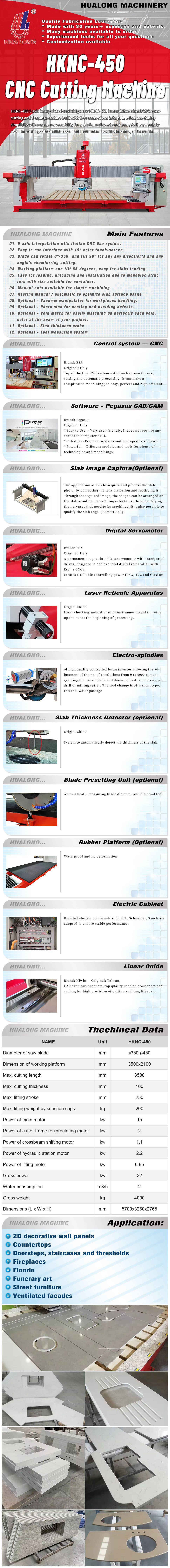 5 axis interpolated cnc bridge saw HKNC-450 is a multifunctional CNC stone cutting and shaping machine built with the needs of workshops in mind, combining simplicity with maximum versatility for a minimum investment budget. It is popularly used for cutting slabs and blocks of both natural and synthetic stone, and ceramic.