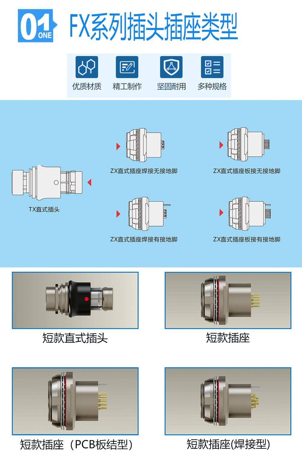 FX series straight plug-in connectors are used in high-density installation, relatively small space and difficult for rotary insertion and separation. It is widely used in the signal connection transmission of AC and DC, high-speed, radio frequency, optical fiber, etc. in radio equipment, infantry equipment, reinforced computers, medical equipment, test and detection equipment, audio and video equipment, data acquisition, industrial control and other occasions in the military and civilian fields.