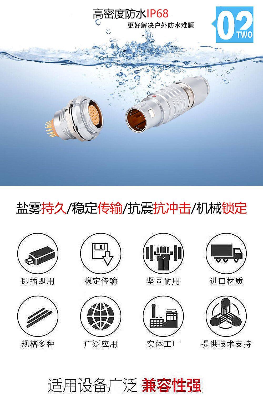 10. After the plug and socket is plugged in, it can achieve water pressure resistance: 2m water depth, 24h. ( Except for optical fiber and radio frequency products)