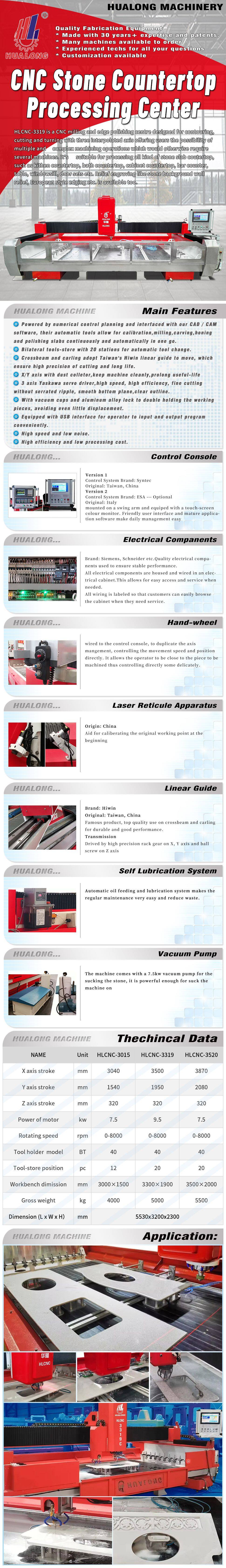 HLCNC-3319 is a CNC milling and edge polishing centre designed for contouring, cutting and turning with three interpolated axis offering users the possibility of multiple and complex machining operations which would otherwise require several machines. It's suitable for processing all kind of stone slab coutertop, such as kithen countertop, bath countertop, cabinet countertop, bar counter, table, windowsill, door sets etc. Relief engraving like stone background wall relief, European style edging etc. is available too.