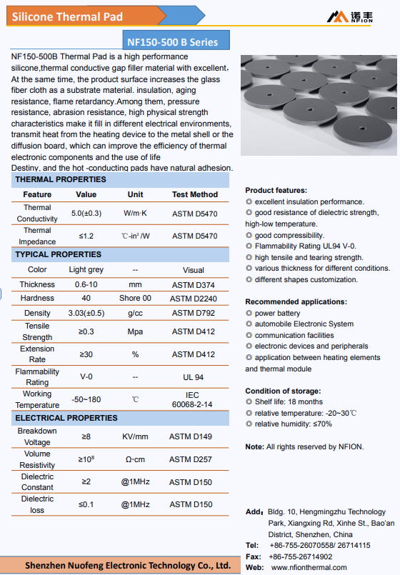 NF150-500B Thermal Pad is a high performance silicone,thermal conductive gap filler material with excellent,At the same time, the product surface increases the glass fiber cloth as a substrate material. insulation, aging resistance, flame retardancy.Among them, pressure resistance, abrasion resistance, high physical strength characteristics make it fill in different electrical environments, transmit heat from the heating device to the metal shell or the diffusion board, which can improve the efficiency of thermal electronic components and the use of life Destiny, and the hot -conducting pads have natural adhesion