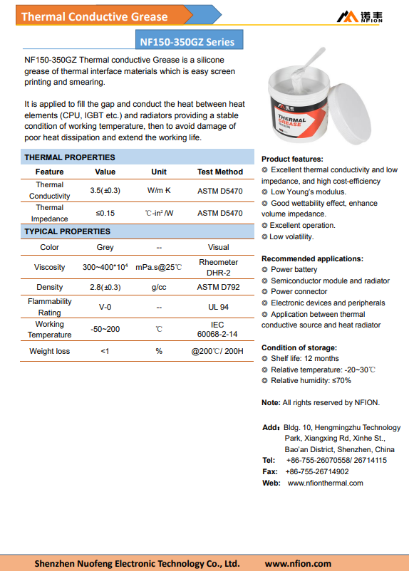 NF150-350GZ Thermal conductive Grease is a silicone grease of thermal interface materials which is easy screen printing and smearing. It is applied to fill the gap and conduct the heat between heat elements (CPU, IGBT etc.) and radiators providing a stable condition of working temperature, then to avoid damage of poor heat dissipation and extend the working life.