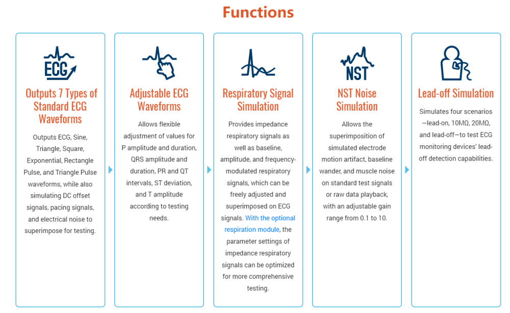electrical noise, respiratory signals, and NST noise, allowing for comprehensive testing of ECG monitoring devices'