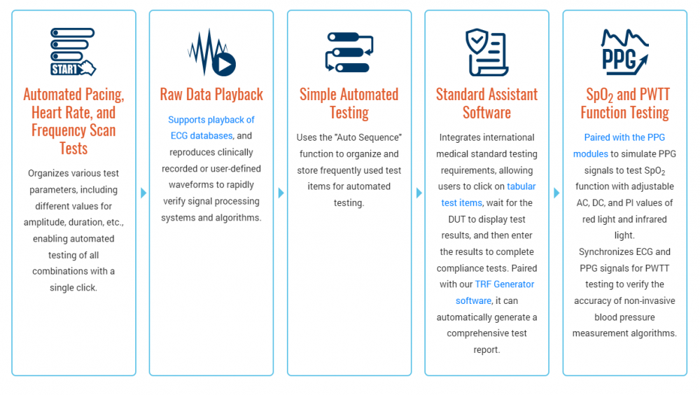 Equipped with the standard assistant software, it enables engineers to conduct compliance tests conforming to the following standards within a few clicks: IEC 60601-2-25, IEC 60601-2-27, IEC 60601-2-47, GB 9706.225, GB 9706.227, YY 9706.247, YY1079, YY1139, YY0782, YY0885, JJG 760, JJG 1042, ANSI/AAMI EC11, and ANSI/AAMI EC13.