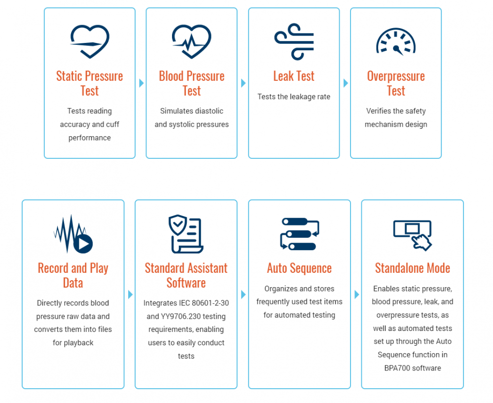 Moreover, the BPA700 integrates essential testing such as static pressure, blood pressure, leak, and overpressure tests, and also features WhaleTeq's exclusive design "Standard Assistant Software", which incorporates the IEC 80601-2-30 regulatory requirements into 14 test items.