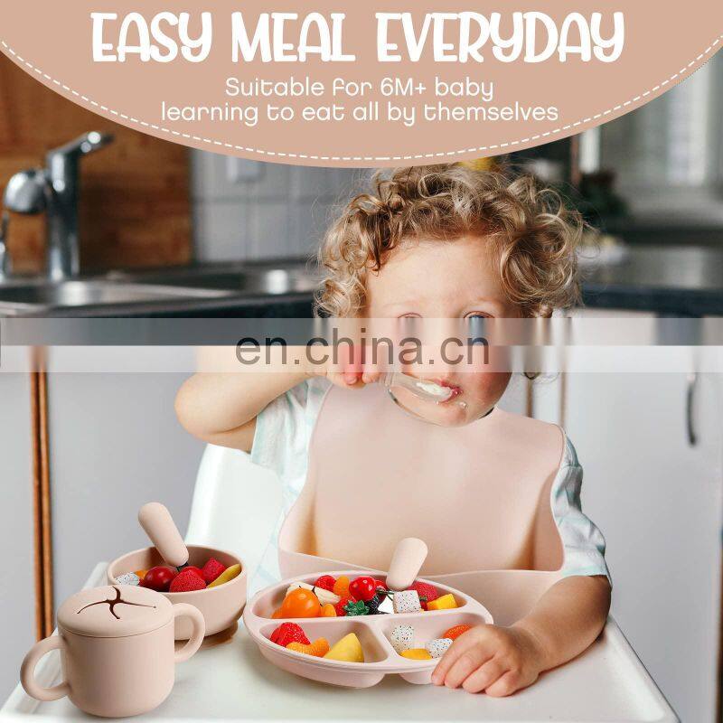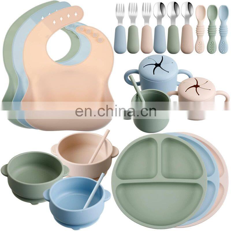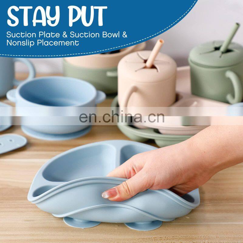 Wholesale Kids Supplies Eco Friendly Led Weaning Silicone Baby Bib Set Tableware 10pcs Bib Plate Suction Bowls Baby Feeding Set