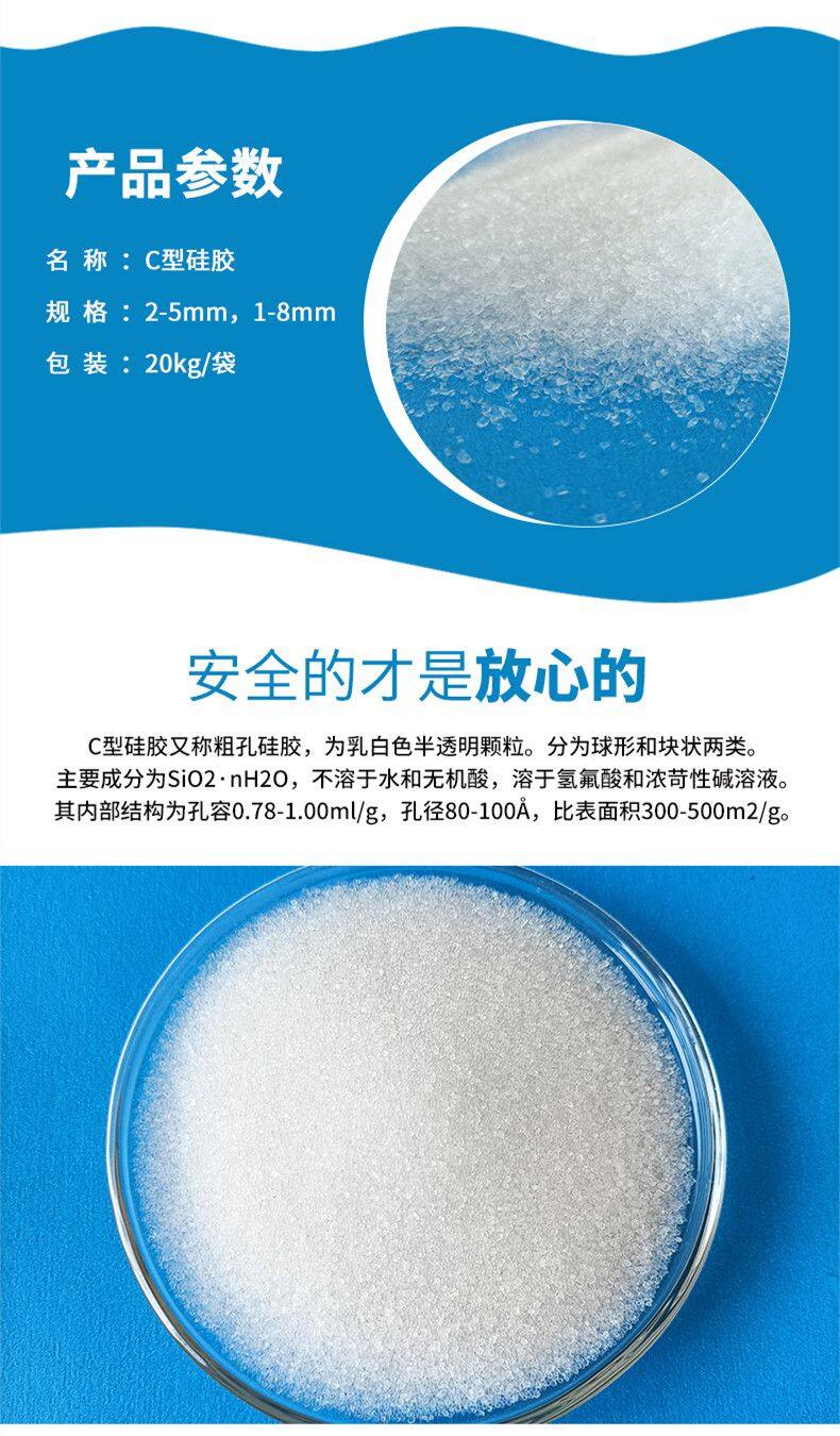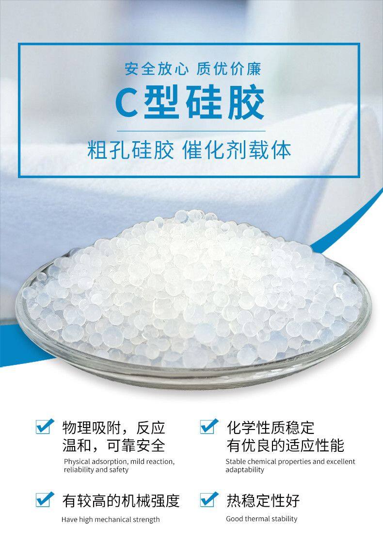 Type C silica gel, also known as coarse porous silica gel, It is a milky translucent particle. It is divided into two types: spherical and block. The main component is SiO2·nH2O, insoluble in water and inorganic acid, soluble in hydrofluoric acid and concentrated caustic soda solution. The pore volume is 0.78-1.00ml/g, pore size 80-100Å, specific surface area 300-500㎡/g.