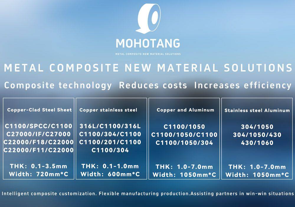 Meihetang Technology focuses on the research and development of cold rolled, hot rolled, and cast rolled metal composite strips: purple copper steel strip T2/H65/H90, brass steel strip H65/IF/H65, H90/F18/H90. 304 multi-layer stainless steel composite materials (stainless steel aluminum cookware), 1050/430 stainless steel aluminum steel, T2/1050/3003 copper aluminum new energy vehicle, 304 stainless steel composite plate, and other two-layer, three-layer, multi-layer metal composite materials, 316L/T2 stainless steel copper single-sided and double-sided mobile phone middle plate new materials, research and development, production, and manufacturing. Our products are applied in the fields of electrical engineering, electronic hardware stamping parts, 3C (computer, communication, consumer electronics), cookware and kitchenware, new energy vehicles, hardware stamping parts, machining, electronic terminals, connectors, soaking plates, heat sinks, etc. We are committed to providing metal new material services and solutions for global small and medium-sized manufacturing customers, reducing costs and increasing efficiency, and innovating and advancing.