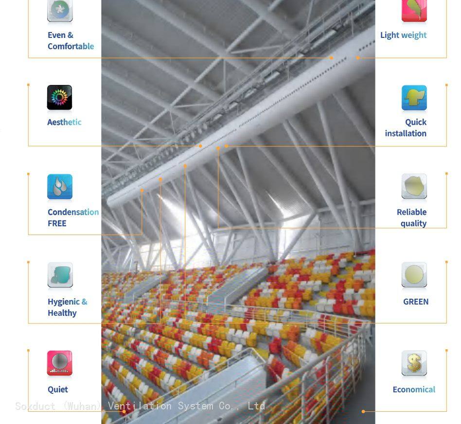Nanosox Fabric Air Dispersion System is very light-weighted. the weight only accounts for 1/40 of that of traditional GI ducts. It is especially suitable for applications such as new buildings or building renovations with limited roof load-bearing capacity.