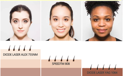 It is performed using gold standard Triple-wavelength 755nm,808nm,1064nm diode laser technology, with energy penetrates deep into the dermis with high average power and a rapid 10 pulse-per-second repetition rate to heat the hair shaft and hair follicle, rather than destroy the oxygen organization around hair follicle.