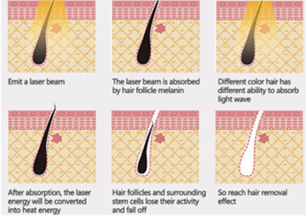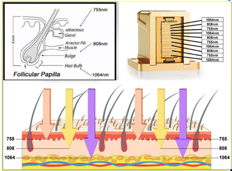 Diode laser hair removal technology is based on the selective dynamics of light and heat. The laser goes through the skin surface to reach the root of hair follicles; light can be absorbed and converted into heat damaged hair follicle tissue, so that hair loss regeneration without injury surrounding tissue. Slight pain, easy operation, the most safe, technology for permanent hair removal now.