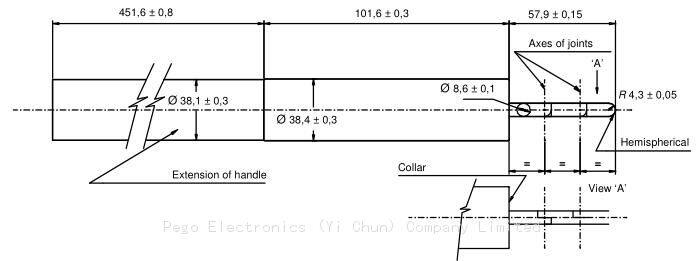 Test probe 18 (small finger probe: Φ8.6-length 57.9) is designed according to IEC61032 figure 12, this is an access probe intended to simulate access to hazardous parts by children of more than 36 months and less than 14 years. The handle is provided with an extension 451.6mm long, and it is detachable to applied with or without this extension, the extension of the handle represents of the arm of child. Both joints shall permit movement in the same plane and the same direction through an angle of 90°