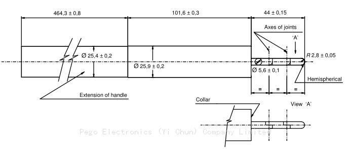 Test probe 19 (small finger probe: Φ5.6-length 44) is designed according to IEC61032 figure 13, this is an access probe intended to simulate access to hazardous parts by children of 36 months or less. The handle is provided with an extension 464.3mm long, and it is detachable to applied with or without this extension, whichever is the more onerous condition. The extension of the handle represents of the arm of child. Both joints shall permit movement in the same plane and the same direction through an angle of 90°