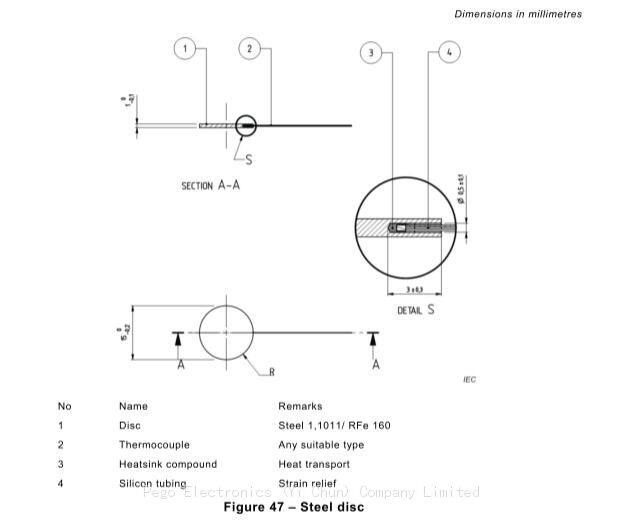 The steel disc is designed according to IEC62368-1 figure 47, the disc is made of steel 1.1011/RFe 160, and configure with K type thermocouple, the end of thermocouple equip with plug.