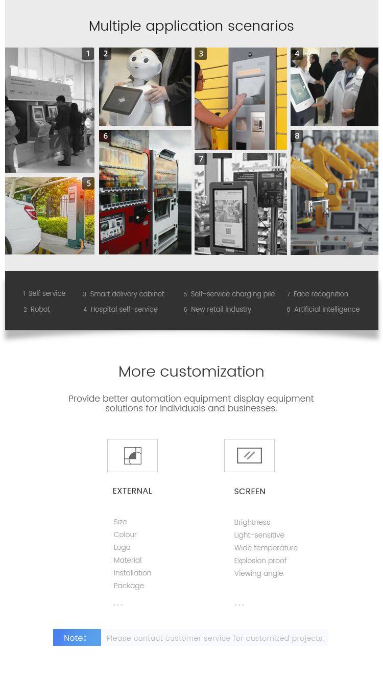 Equipment use | Application field | Military equipment, aerospace equipment, rail transit/communication, professional photography display, smart supermarket, smart robot, smart meeting room, factory assembly line/POS cash register, car GPS, elevator entrance, commercial office building, exhibition site, etc. occasion | ||