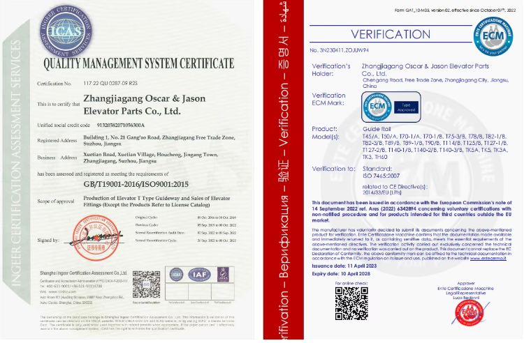Zhangjiagang Oscar&Jason ELevator Parts Co., Ltd., as a pacemaker in promoting the industrial development by advanced technologies, is an elevator component manufacturer which is close to Zhangjiagang Bonded Area and enjoys a unique advantageous geographical position and investment environment. Since its establishment in 2011, it has realized innovative development with advanced equipment and technologies and excellent talents, and its higher quality and efficiency have impressed the whole world. We advocate the idea of putting product quality first, have obtained the certification of the ISO 9001 quality system and manufacture products according to the ISO 7465 standard. Our products have the same high-standard product quality and excellent performance no matter where they are. Constant technical innovations have kept improving the market share of our four product series (the T-shaped guide rail series, the hollow guide rail series, the cold-drawn guide rail series and the elevator comment series) at home and abroad (Guangdong, Shenzhen, Zhejiang, Suzhou and Changzhou) (India, Egypt, Turkey, South Korea, Vietnam, the USA, etc.) while meeting requirements of global customers. We have established strategic partnerships with multiple elevator component manufacturers in China's largest elevator and component production base-Suzhou Fenhu Elevator Industrial Park-and provides perfect solutions to all elevator components purchased by customers. We cooperate with excellent complete elevator manufacturers in terms of technology, manufacture and service (Canny, Sumitomo Fuji and Express). We have also established stable supply relationships with multiple large domestic elevator factories, keeping improving our competitive advantage in the global elevator guide rail industry.