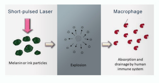 Ten times effect of traditional Q-switch nanosecond laser Pico second laser is used to break up pigment particles under skin. Then, lymphatic system latches onto the pigment particles and carries them away to get excreted.