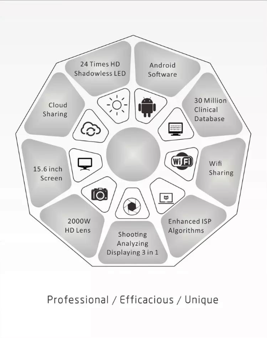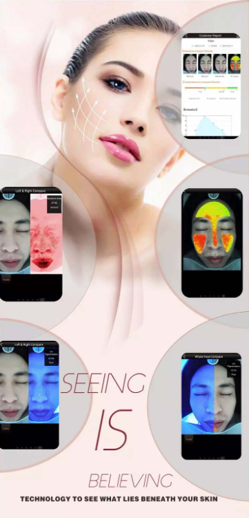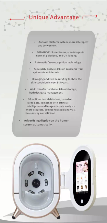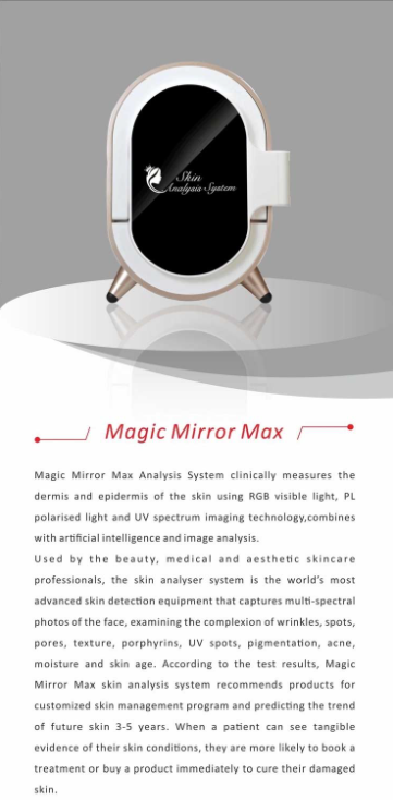 Magic Mirror Max is the world's most advanced skin detection equipment together with shooting, analyzing, displaying 3 in 1. It adopts RGB, UV, PL spectral imaging technology, combines with artificial intelligence and image analysis,12 years market testing, 30 million clinical databases, achieving 15 seconds efficient skin analysis. Such as: spot, pore, moisture, texture, wrinkle and so on total 12 dermis and epidermis skin problems. According to the test results, Magic Mirror Max recommends products for customized skin management program and predicting the trend of future skin 3-5 years. It is an essential skin detection equipment for cosmetic company, beauty salon, skin clinic and training school, the market demand rate can be as high as 100%.