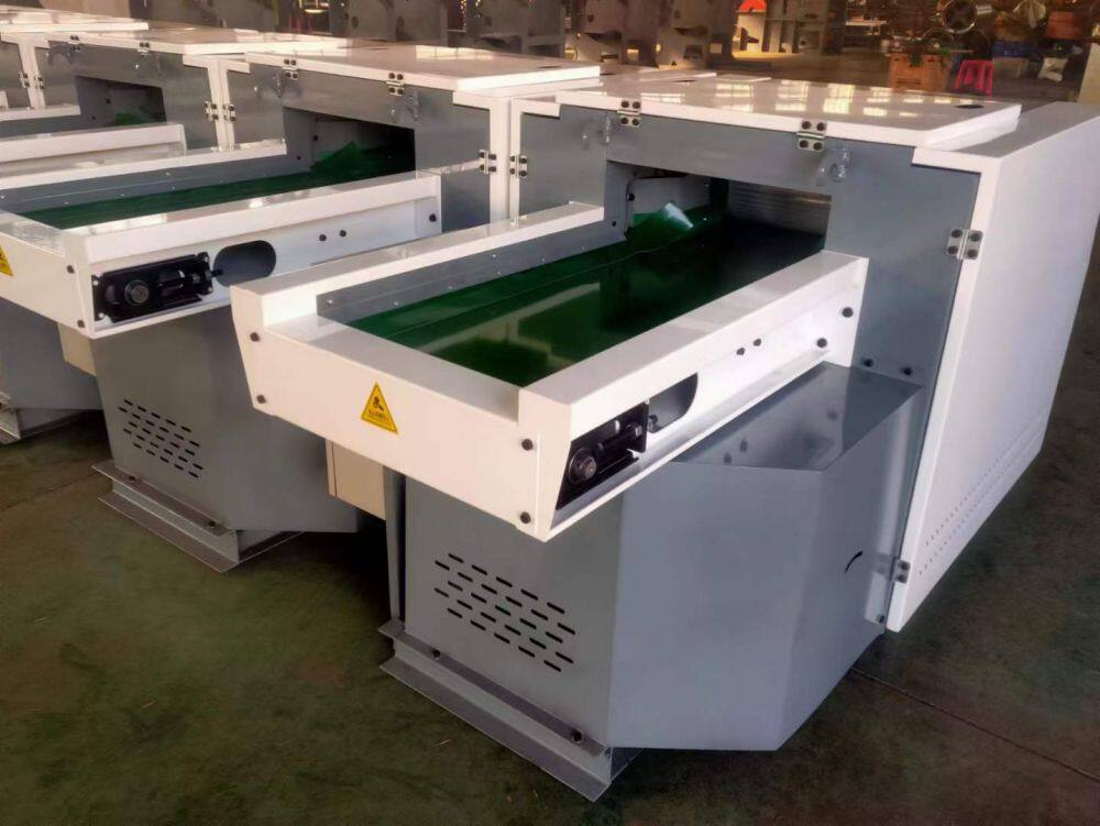 This cutting machine adopts vertical cuting method. The waste material will be transported by conveying belt to the