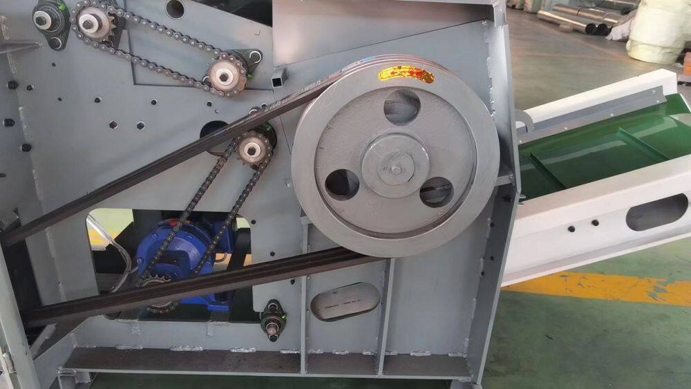 cutting device and be cut by knives in required sizes for further recycling use.This cutter uses low speed and large torgue motor. With Cycloidal reducer and speed frequency control on conveyingprocess, all parts are easy to be operated and maintained. This machine wil help to improve production efficiency with itsdurable, stable and safe performance