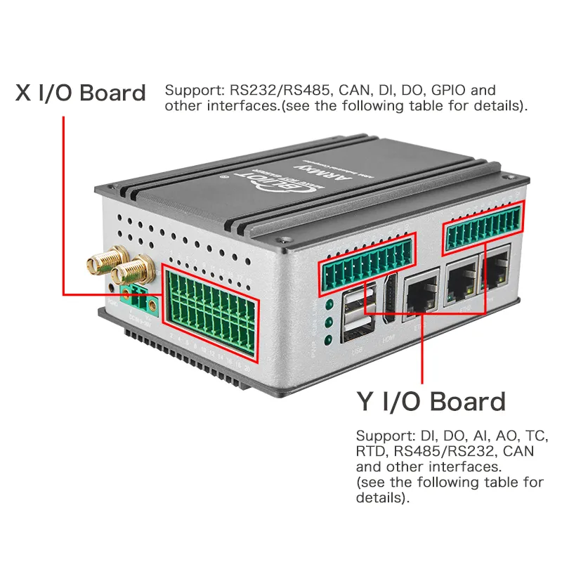 IO Slot | X series IO board slot: 1, X series IO board, support RS485, CAN, RS232, RS422, DI, DO, GPIO, etc; Y series IO board slot: 2, Y series IO board, support RS485, CAN, RS232, RS422, DI, DO, Relay output, AI, AO, PT100, PT1000, TC, etc. |