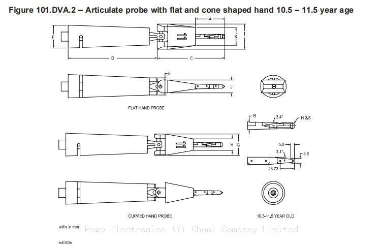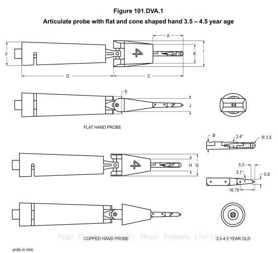 The articulated probe meets the requirements of UL60335-2-24 Annex 101. DVA and figure 101. DVA.1 and DVA.2. It’s used to hazard assessment for moving parts and probe to simulate access to hazardous parts by 3.5-4.5 and 10.5-11.5 years old Children’s hand.