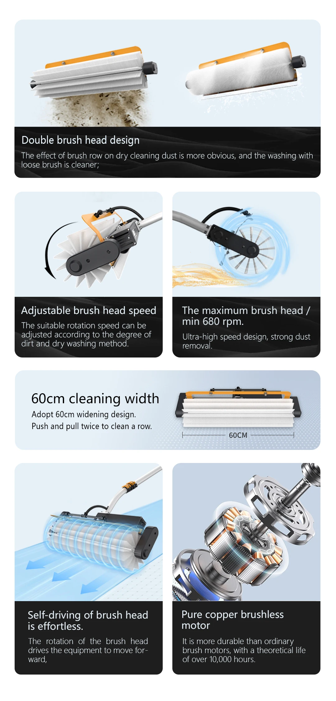 The brush head rotates at high speed to drive the cleaning machine forward, and it is effortless to push and pull by holding the telescopic rod.