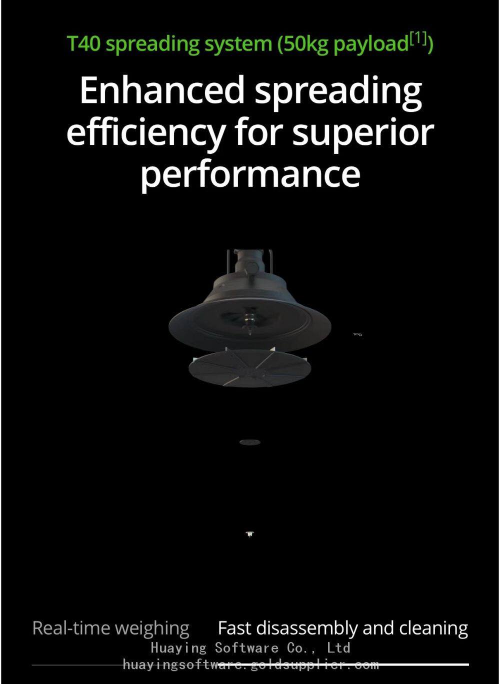 DJI AGRAS T50 elevates drone agricultural operations to new heights. It inherits a powerful coaxial twin-rotor propulsion system and a split-type torque resistant structure for next level stability when carrying 40 kg spraying[1] or 50 kg spreading[1] payloads.