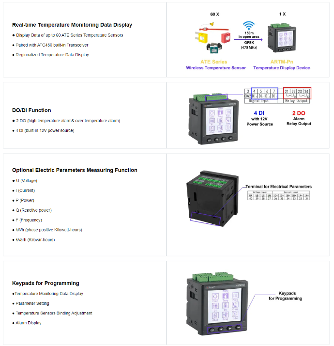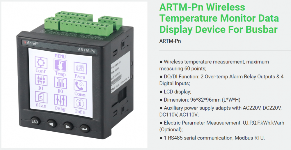 Acrel ARTM-Pn Panel Mounted 3P Online Wireless Temperature Measuring Equipment for Electric Parameter Meausurement