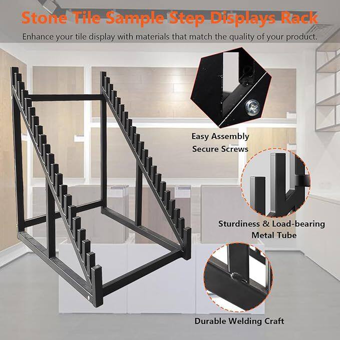 Stable & Sturdy Display Shelf The floor tile display rack made with metal and triangular structure, which support amounts of weight to ensure the tiles or sample security. Strong load-bearing capacity without wobbling or tilting. Quick and hassle-free assembly.