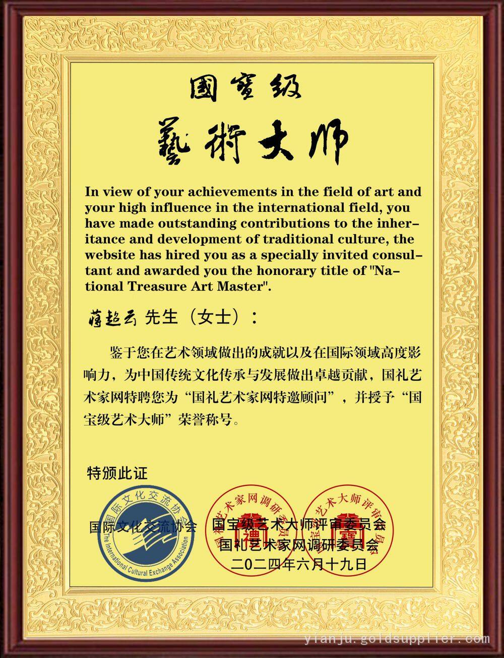 In view of the author's achievements in the field of art and your high influence in the international field, you have made outstanding contributions to the inheritance and development of traditional culture, the website has hired you as a specially invited consultant and awarded you the honorary title of "National Treasure Art Master".
