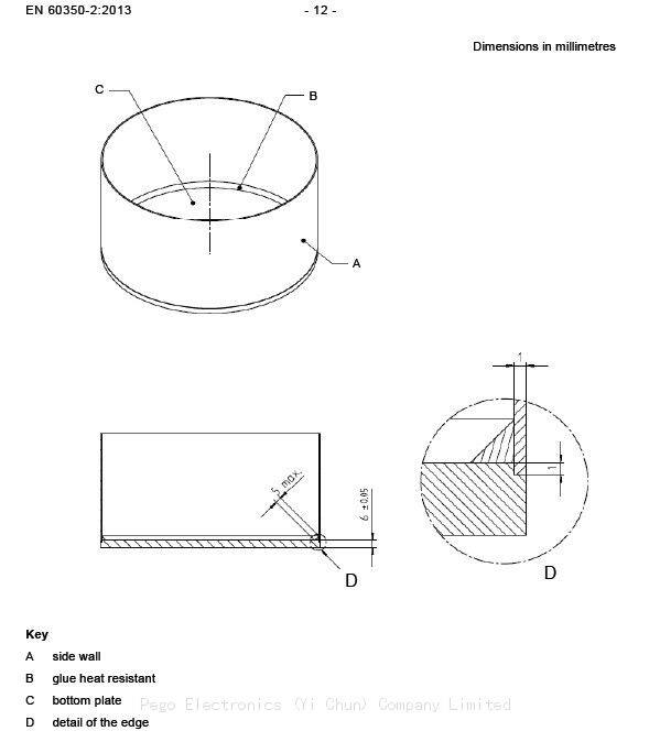 The vessels are designed according to EN60350-2:2013 figure Z1, the side wall of the vessel is made of 1.4301 stainless steel (stainless steel AISI 304) with thickness 1mm±0.05mm, the bottom of the vessel is made of 1.4016 stainless steel (stainless steel AISI430) with thickness 6mm±0.05mm, the cookware is cylindrical without handle or protrusions. And the lid is made of aluminum, and thickness is 2mm±0.05mm, each hole circle of the lid has a diameter of 16mm±0.1mm, the holes shall be evenly distributed on the hole circle. The lid is flat and can accommodate a temperature sensor in the center.