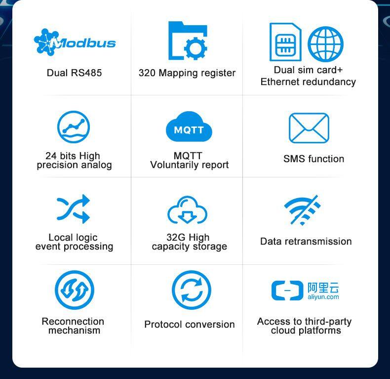 The Industrial RTU features 8 digital inputs, 6CH 24 bit analog or PT100 Resistance Temperature Detector (RTD) inputs, 4 relay outputs, 1 temperature and humidity input, 1 Ethernet RJ45 port, 2SIM slots, and 2 RS485 serial port supports 320 IO tags via Modbus RTU protocol.