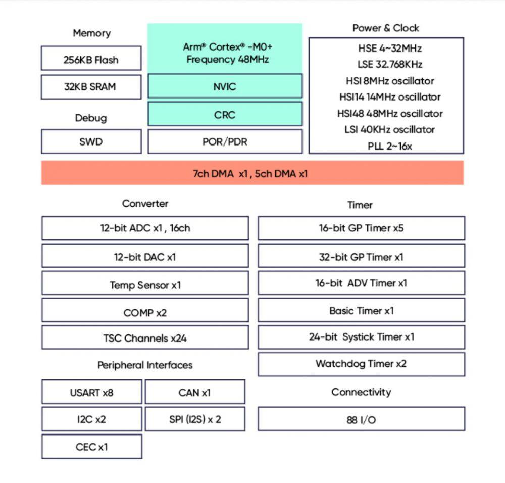 APM32F091xBxC series MCU, based on Arm Cortex-M0+ core Supports 256KB on-chip flash memory, provides a variety of communication interfaces, up to 8 USART to enhance the communication function, built-in HDMI CEC and TSC capacitive touch function; Supports CAN protocol communication, the operating temperature range of -40 ℃ ~ +105 ℃, is suitable for expanding the smart home appliances, industrial equipment and automotive electronics and other applications.