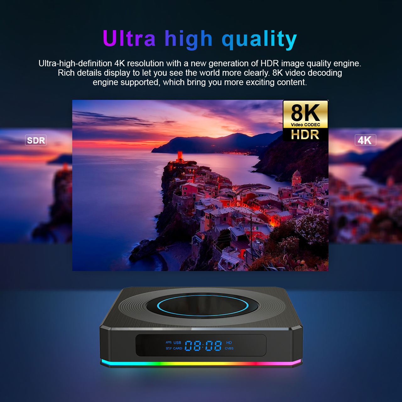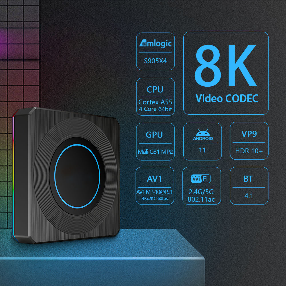 [3D 8K HDR & AV1 Decoding]The Amlogic S905X4 android 11 tv box supports 8K Ultra HD resolution and AV1 decoding new technology (AV1 is 30% better than H.265 or VP9), streaming image more smoothly and clearly. 3D dynamic bringing realistic visual effects.