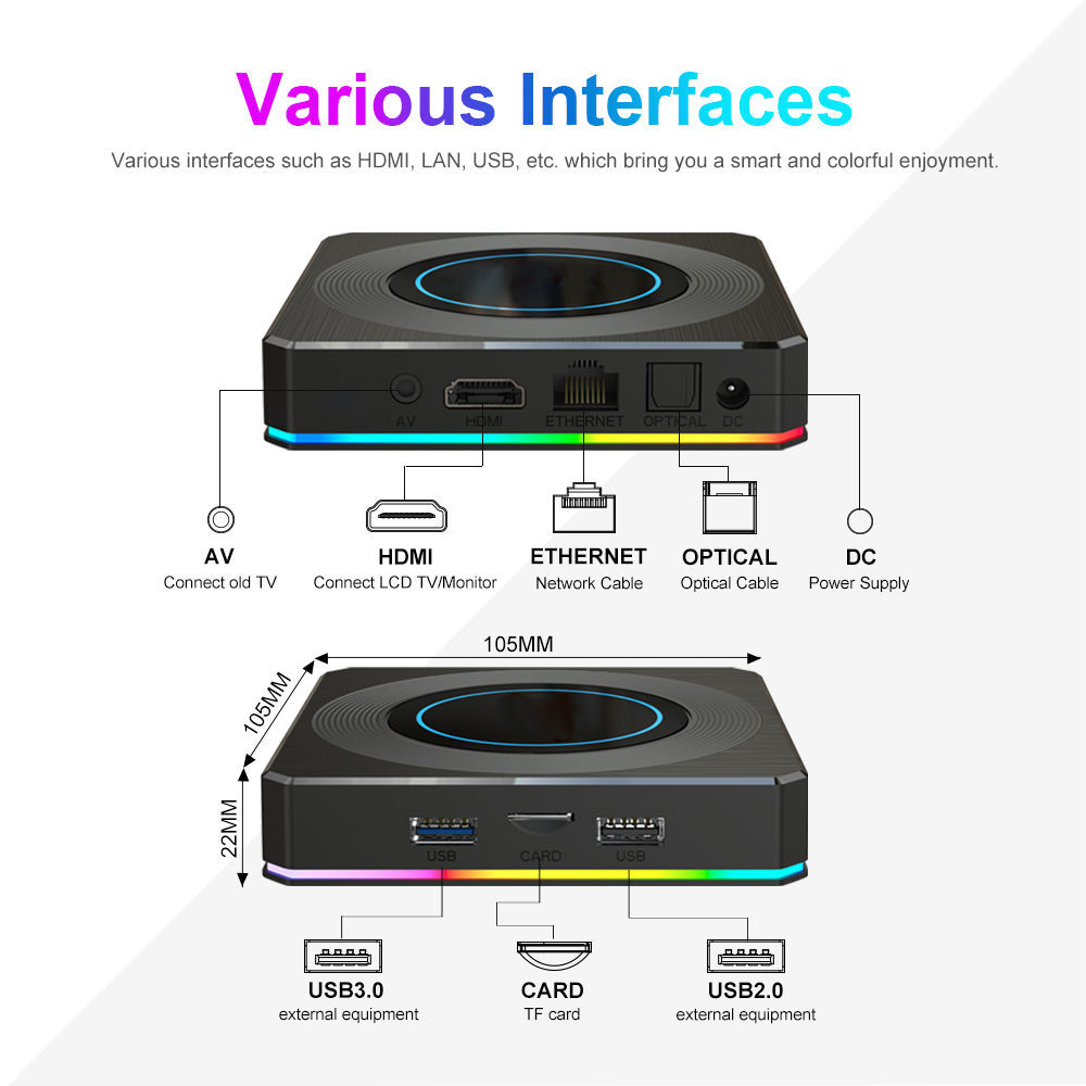 [2GB RAM 16GB ROM & USB 3.0]The 8k android box 2022 comes with 2GB RAM 16GB ROM storage capacity which have sufficient room to running app and loading videos. You also can expand the storage through extra hard drive, micro SD card or an external USB device(up to 128G), Never worrying about freeze or buzz due to lack of memory. USB 3.0 has the advantage of high speed transmission, it can meet the requirement of fast transfer.