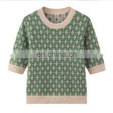 Custom Fashion Jacquard Crew Neck Cashmere Pullover for Women Floral Short Sleeves Knitted Sweater Casual Winter OEM Service