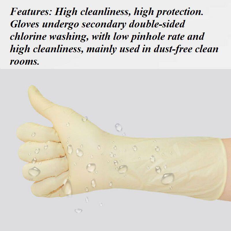 Features: High cleanliness, high protection. Gloves undergo secondary double-sided chlorine washing, with low pinhole rate and high cleanliness, mainly used in dust-free clean rooms.