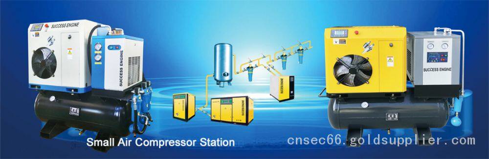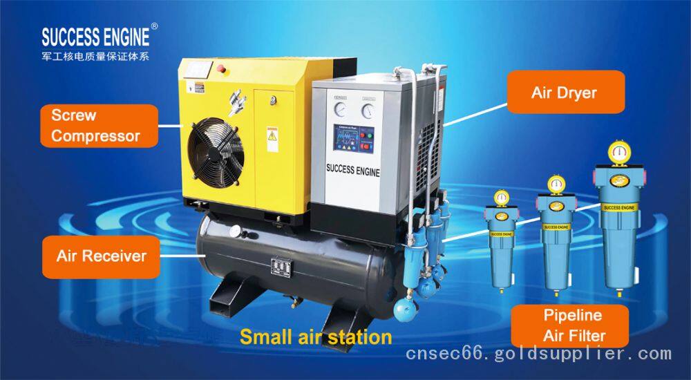 SUCCESS ENGINE Small Screw Air station ---Dryer & filter integrated air station The small air station is integrated with screw air compressor, air tank, dryer and three-class filters. It is installed on the air tank through pipeline connection. And the tank is equipped with multi air outlets to meet the access of different air using equipment. SUCCESS ENGINE turns the complicated compressor station into a simple integrated small air station, which has complete functions, convenient mobile operation, dry and clean exhaust air, and is the preferred equipment for decentralized small gas operation. Integrated Small Screw Air Station F.A.D: 0.5~2.0m3/min Pressure: 5.0 ~ 15bar Small air station integrated with screw air compressor, air tank, dryer and three-class filters. It is installed on the air tank through pipeline connection. And the tank is equipped with multi air outlets to meet the access of various air using equipment. SUCCESS ENGINE Production Workshop Factory Environment |