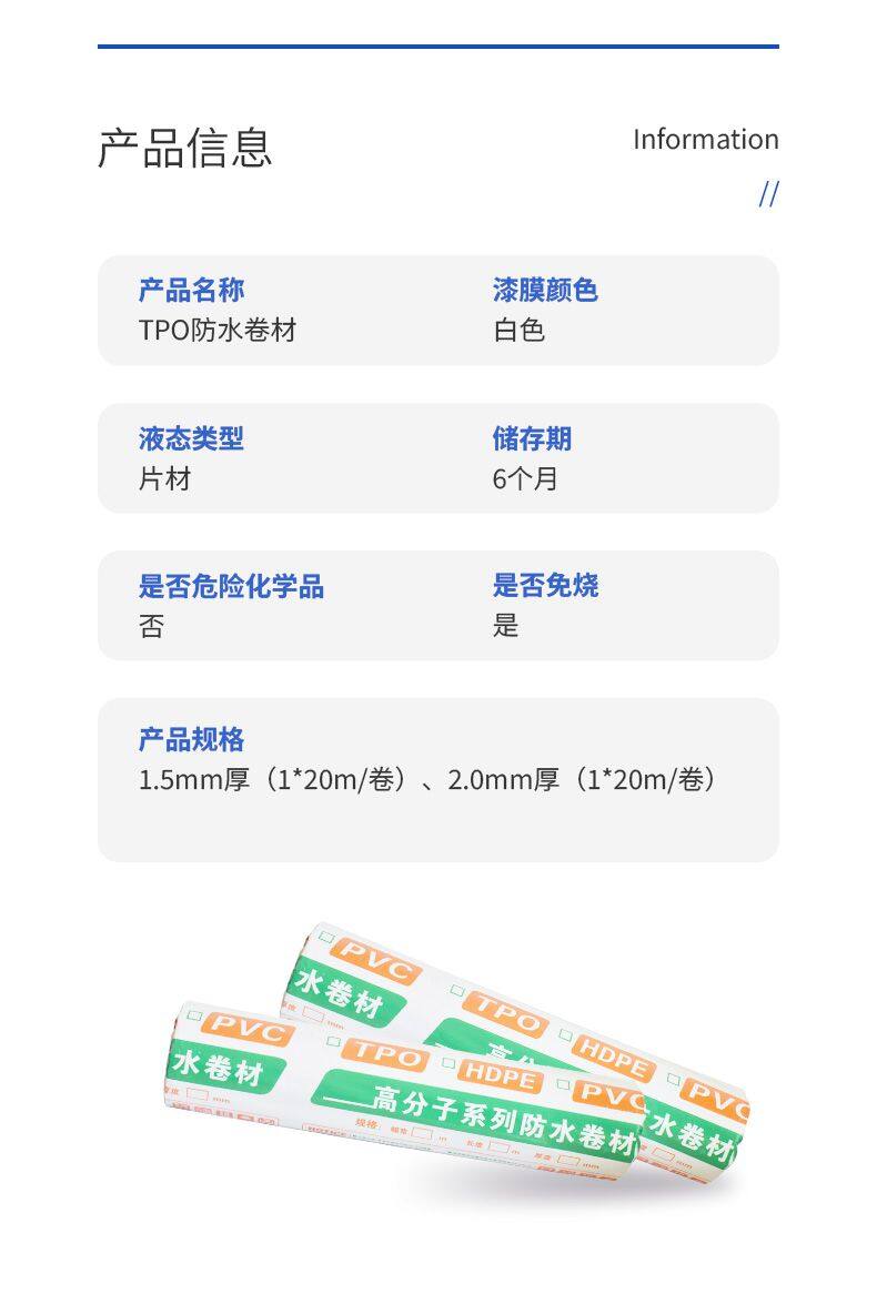 TPO waterproof membrane is a kind of macromolecule materials with excellent properties, which consists of polyvinyl chloride resin mainly and various dedicated auxiliaries, anti-aging ingredient, produced by advanced equipment and technology. TPO features with strong tensile strength, high elongation, low shrinking rate, good low temperature flexibility, long lifetime, stable properties, reliable quality and convenient construction.