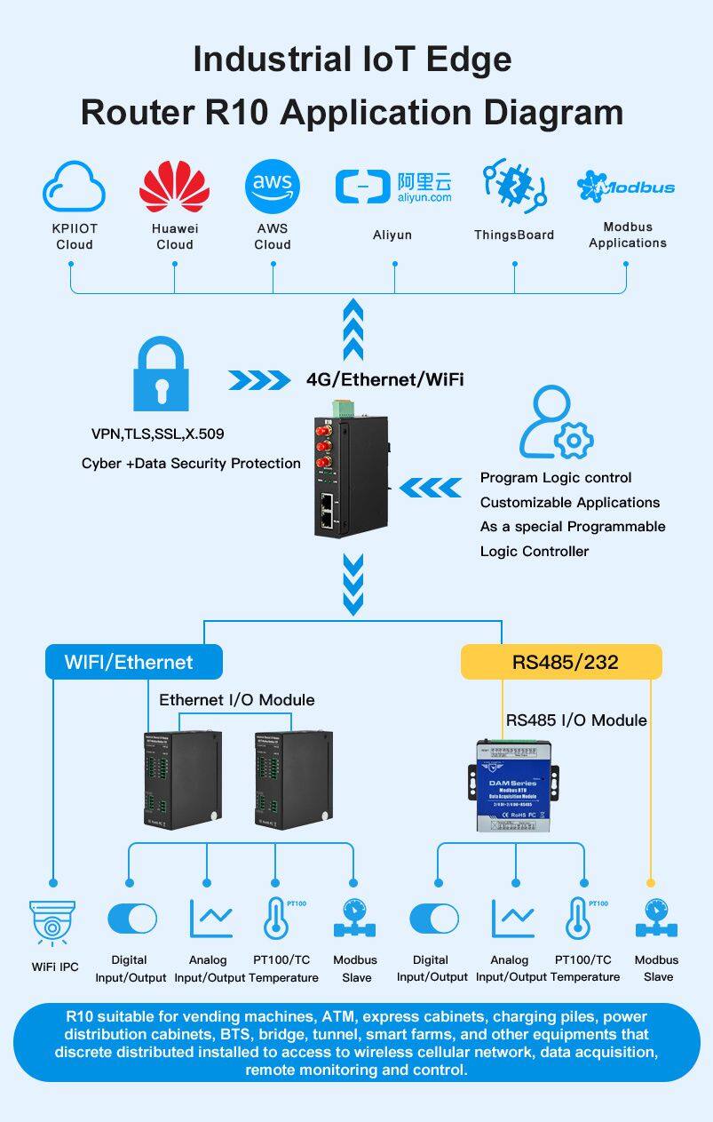 The R10 industrial router can provide wireless access network, and also can performs Modbus Master to poll meters over RS485/232 or LAN ports, then upload the data to cloud platforms under MQTT format, e.g.: AWS IoT, ThingsBoard. And the R10A industrial router can connect the remote I/O modules either by RS485/232 or Ethernet cable to monitoring data or switch on/off devices, etc.