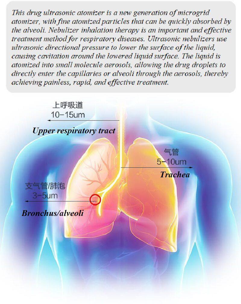 Working principle: This drug ultrasonic atomizer is a new generation of micro mesh atomizer, with fine atomized particles, micro mesh type mist, 3um ultrafine particles, and easier absorption. Can be quickly absorbed by the alveoli. Nebulizer inhalation therapy is an important and effective treatment method for respiratory diseases. Ultrasonic nebulizers use ultrasonic directional pressure to lower the surface of the liquid, causing cavitation around the lowered liquid surface. The liquid is atomized into small molecule aerosols, allowing the drug droplets to directly enter the capillaries or alveoli through the aerosols, thereby achieving painless, rapid, and effective treatment.