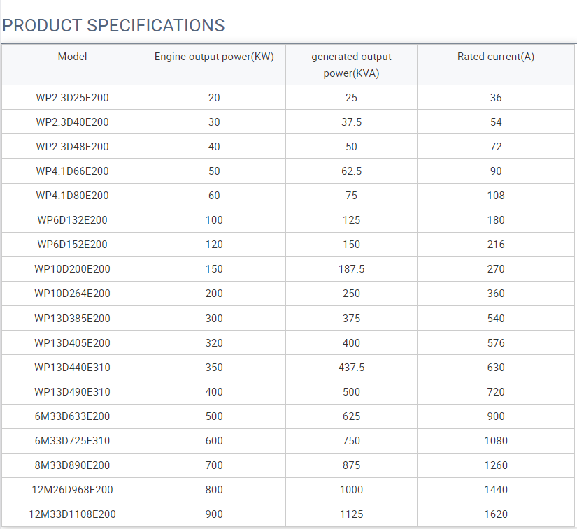We have so wide open generator set ranges from 22.5kva to2500kva for the diesel generator set,for example, Weichai series diesel generator set,shangchai series generator set,yuchai series generator set,cummins series diesel generator set,volvo series generator set,jichai series diesel generator set etc;power from 19kva to 1500kva for gas generator set,for example,jichai series of gas generator set,ricardo/steyr series gas generator set,weichai series gas generator set etc.