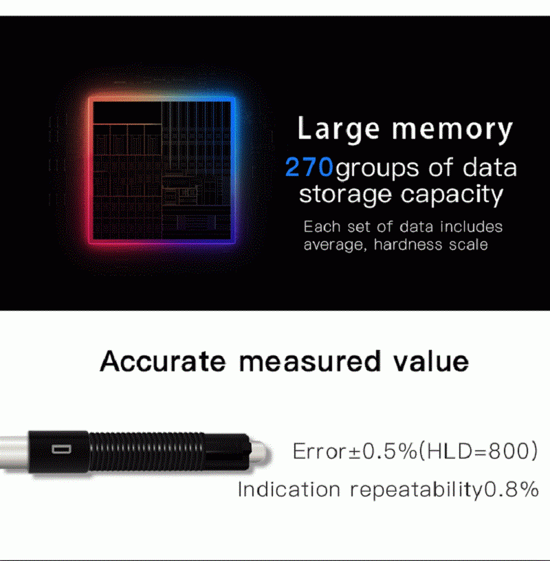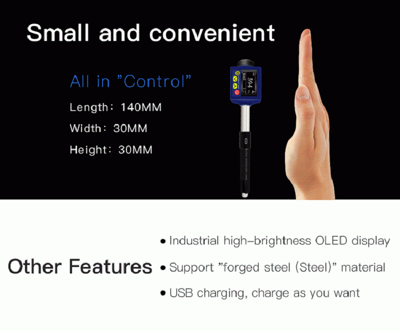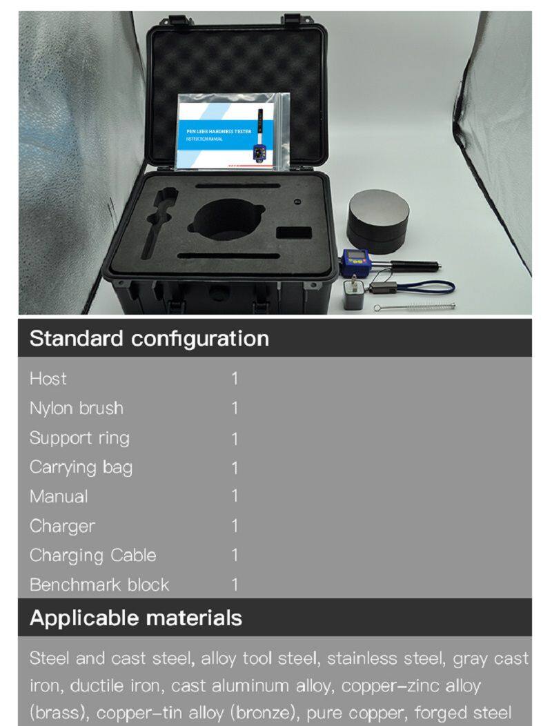 The Leeb hardness tester is pen shaped, easy to carry, and can measure multiple hardness values (HL/HV/HS/HRC/HRB/HB) with an indication error of ± 0.5%. It can also measure multiple materials.