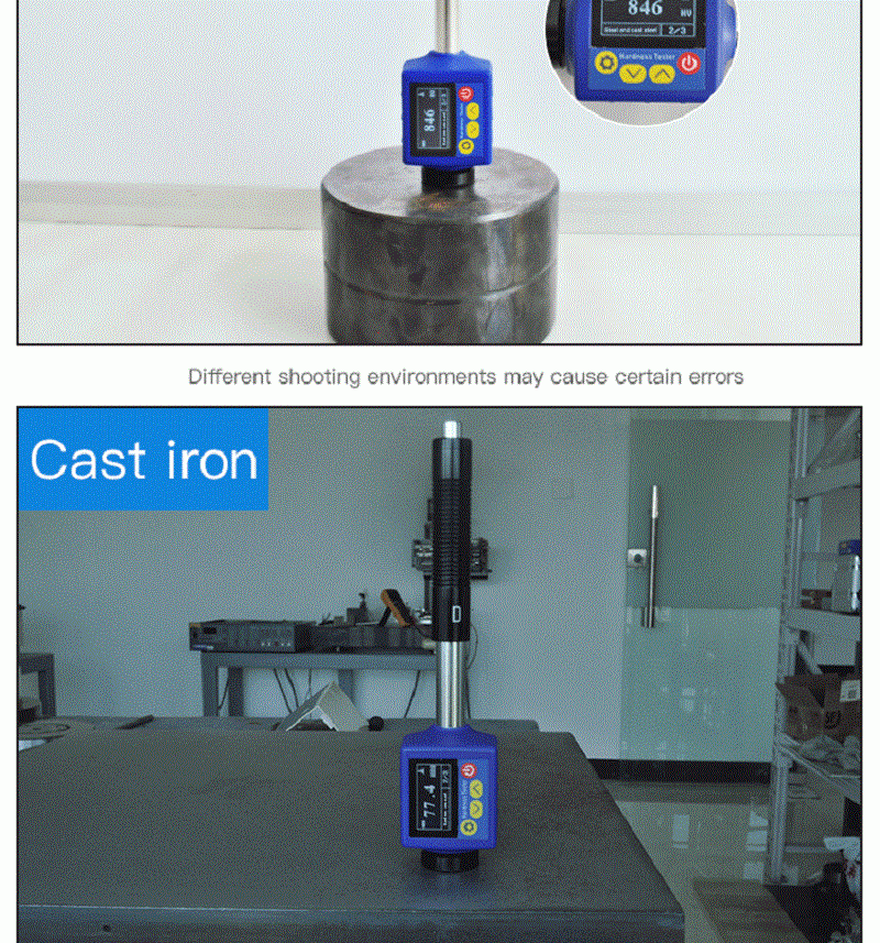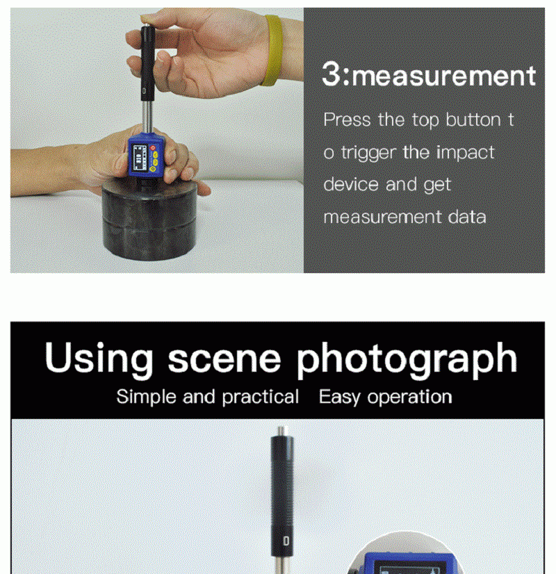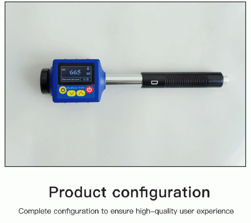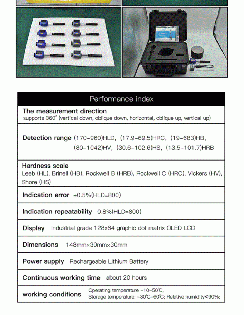 This instrument is a portable measuring device mainly used for large workpieces that are not easy to transport. It can measure different hardness values of different materials anytime and anywhere, and the battery is a built-in lithium battery.