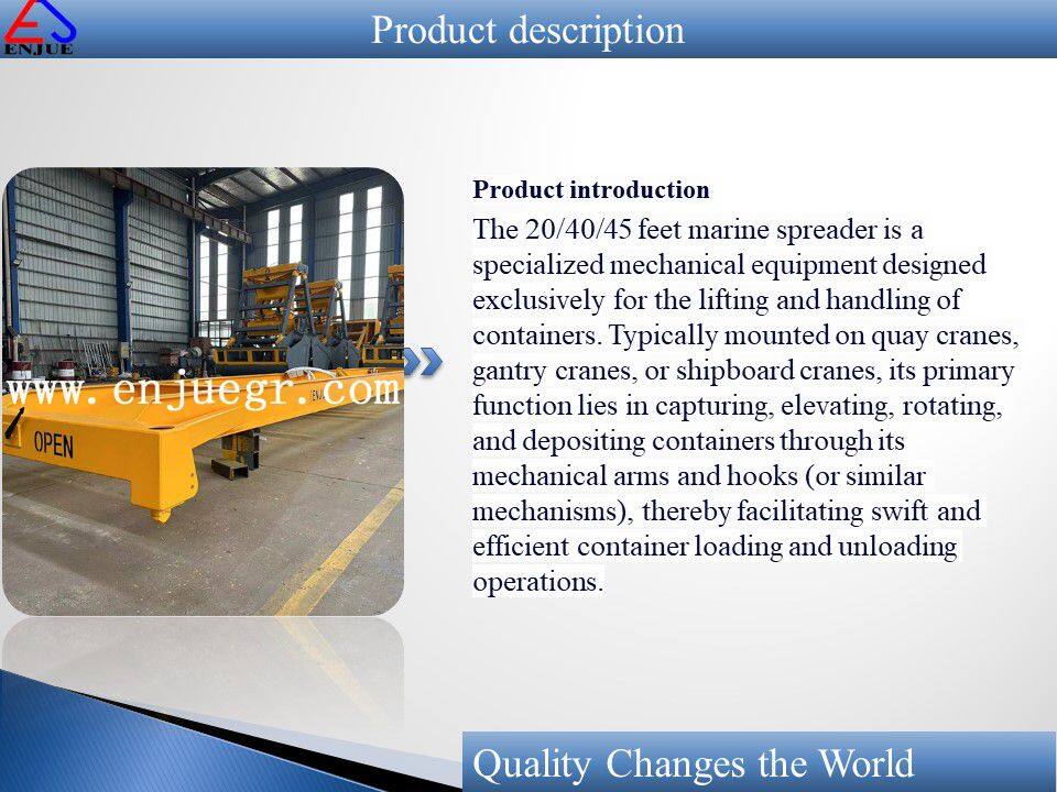 A semi-automatic spreader is a mechanical device used for loading and unloading containers. While some of its operational components are automated, it still requires manual assistance to complete certain processes. Depending on its size and application range, semi-automatic spreaders are typically categorized into two specifications: 20-foot and 40-foot, to accommodate the loading and unloading needs of different-sized containers.