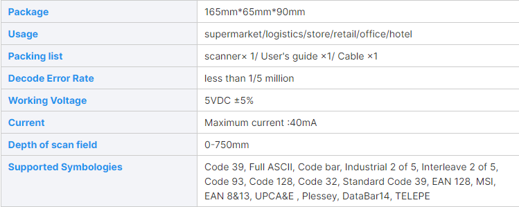 | Model Number | M1 | Type | Barcode Scanner | |