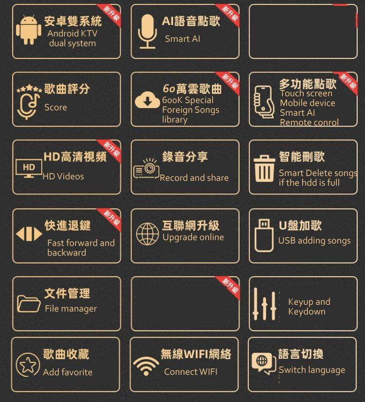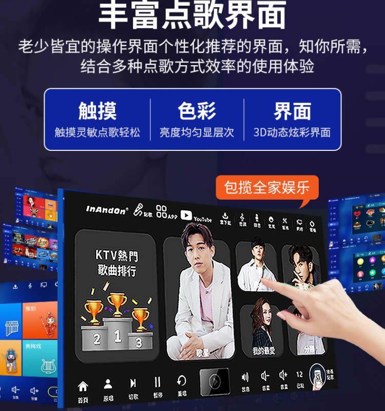 5.Songs quantity: Chinese English songs preloaded for directly karaoke singing.More than 10 countries songs on cloud for free download