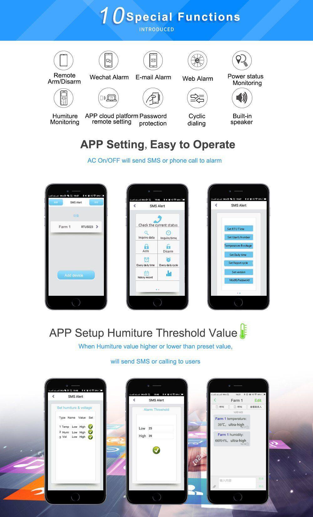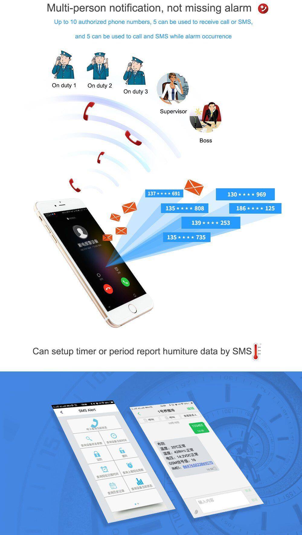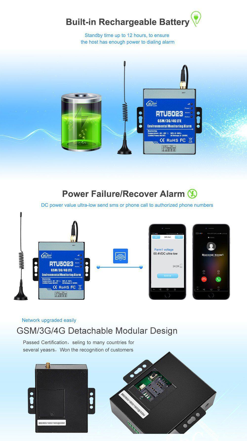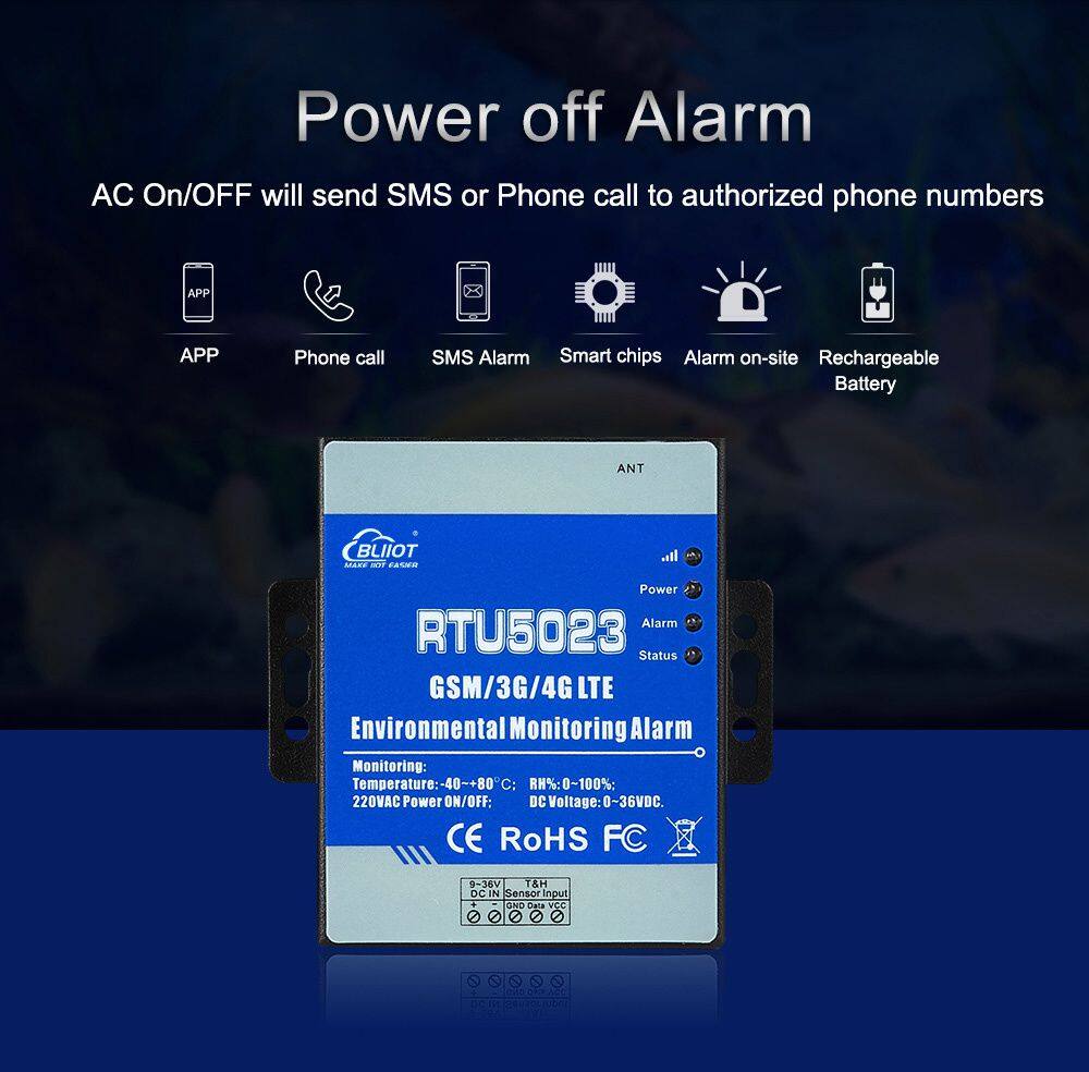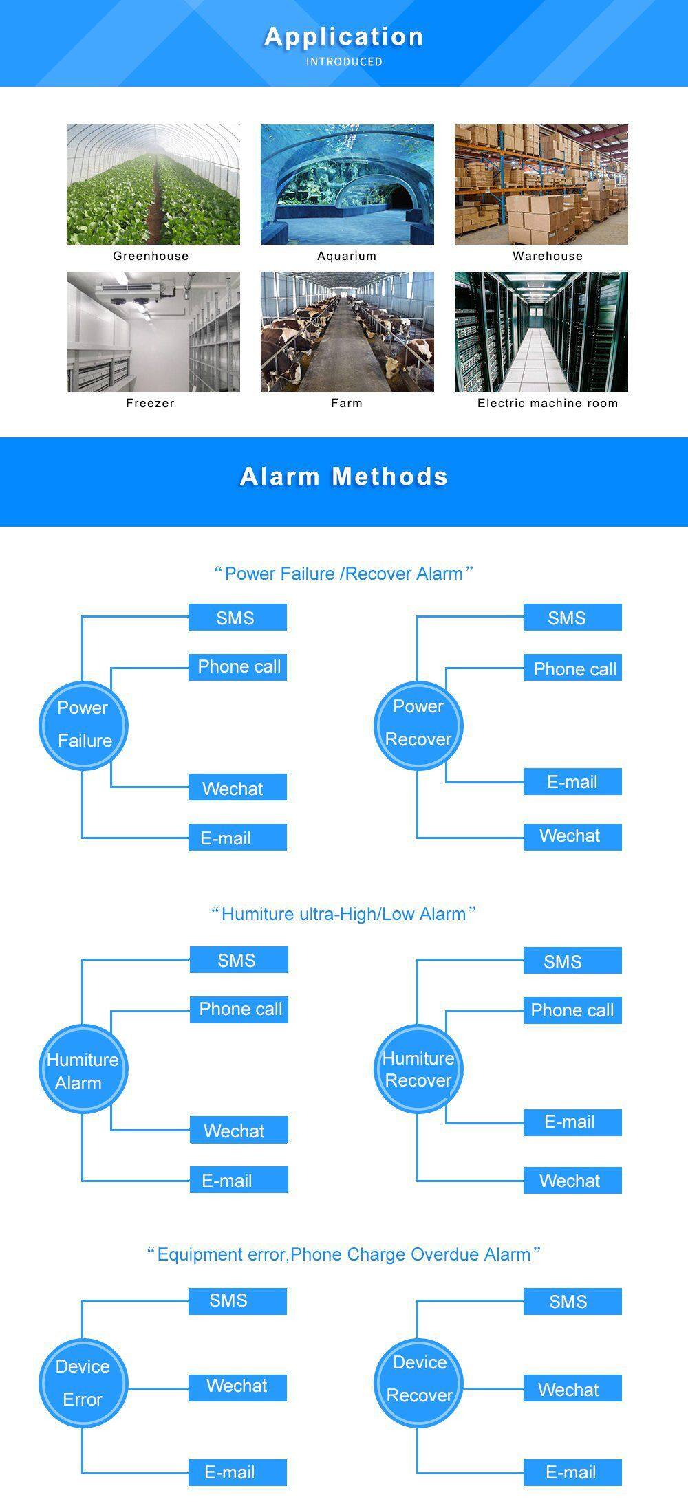 The GSM 3G 4G LTE Environmental Monitoring Alarm is special for remotely monitoring onsite temperature,humidity,power status through wireless GSM/3G/4G Network.When the temperature,humidity, power voltage exceed high threshold or low threshold value.